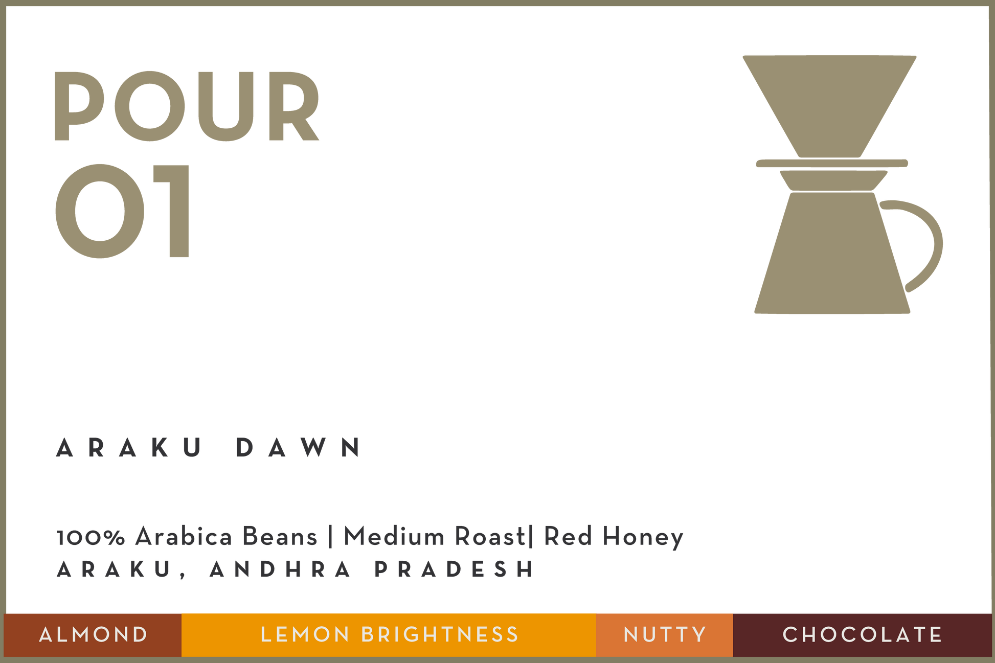 Pour 01 features a beautiful Red Honey processed coffee, one of our favorite processing styles sourced from Avani Origins and grown by tribal farmers in the Araku region
